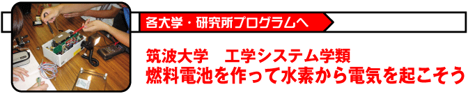 筑波大学は筑波研究学園都市の中核にある総合大学です。キャンパスは森林公園を基調とした景観の中に、変化に富んだ斬新なデザインの施設が効率的に配置されています。建学の理念においては、国内的にも国際的にも開かれた大学であることをその基本的性格とすることを標榜しております。 特に工学を始めとする科学的な分野では、地の利を活かし近隣の国立および民間の研究機関と有機的な関係を積極的に築きつつ、研究ならびに教育活動を推進しています。 今回のサイエンスキャンプは、第三学群工学システム学類エネルギー工学主専攻が主体となってプログラムを提供しています。