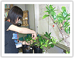植物コース、微生物コースに分かれ、大気汚染の植物へ影響と化学物質の微生物相への影響を調べます。植物コースでは植物に大気汚染を暴露して葉の障害の様子を観察します。微生物コースでは様々な環境から採取した土壌にどのような微生物がいるのかを調べます。