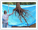 実際に掘り出した根の重量を測定後、地下部の根も含めた森林のCO2吸収量を算出し、それから得られた地上部と根の関係から、木の根の重量推定式を作成し、実際の立木のCO2吸収量を推計します。
