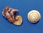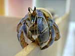 写真のムラサキオカヤドカリは、体が大きくなる種類です。名前どおりに体の色が紫色をしています。眼は複眼からできていて、昆虫の眼によくにています。眼のつけ根の両側から生えている細長い竹ひごのようなものは触角です。この触角を使って前にある物にふれて感じとり、前に進んで行くことができます。貝殻の中の体はやわらかくなっています。貝殻が右巻きになっているので体も右巻きになっています。ツメは左手が大きく、右手は小さい。大きなツメで食べ物を食べたり、外敵とたたかって身を守ります。食べ物は雑食性でなんでも食べます。
