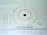 ハガキ程度の白い厚紙に直径13mmと10mmの二重円をえがき、真ん中をパンチで直径約6mmにくりぬきます。この穴にスチロール球をおしこみ、木工ボンドで接着固定しましょう。木星同様、マジックなどで黄色く色付けをしたら、はさみで円にそって切り抜き、軌道用線にゆっくりとさしこみます。そして、半径約9.5cmの円にして両端を固定します。 - 木星と土星の軌道を、軌道支持棒にのせ、2ヵ所をボンド・セロテープで固定します。