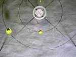 中心部に針をさしこんだ直径6mmのスチロール球を、ステンレス鋼線にゆっくりとさしこみます。鋼線は半径約5cmの円にして、両端をボンドとセロテープで結合します。マジックなどで黄色く色付ければ木星の完成です。 -