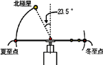 - 北極星のビーズを取り付けた針金の一端をセロテープで冬至点に固定します。このとき、真上より23.5°夏至点側にかたむいた方向にします。(図3)