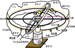 - 星座フィルムを、軌道支持棒の端の外側に貼り付けます。「春分点→夏至点→秋分点→冬至点」の順にセロテープで固定し、このとき、黄道面に黄道を合わせるようにします。